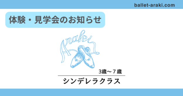 2026年 春それぞれの春、おめでとうございます!荒木良子バレエアカデミーでは、新年度に伴い、シンデレラクラス(対象:3歳~7,8歳)体験・見学会を開催します。ご興味のある方は、お問い合わせください。幼稚園生、小学生は春休み期間を利用して普段とは違う時間帯でスタジオ見学、質問等受けることも可能です。1つ、4/3(金) 16:00~17:00の体験会が決定しております。別日開催の詳細は、お問い合わせください。